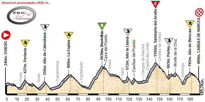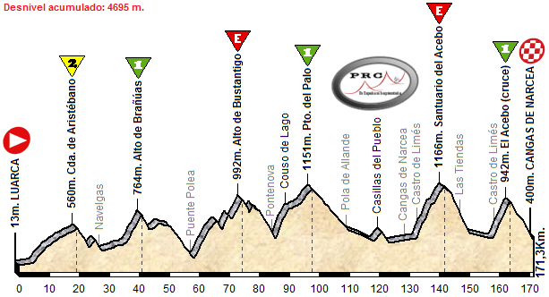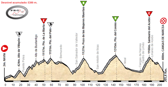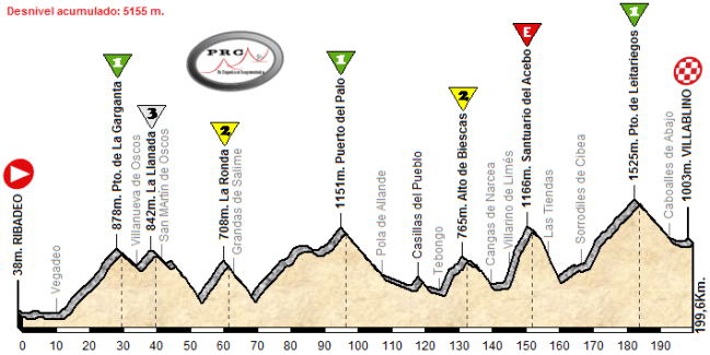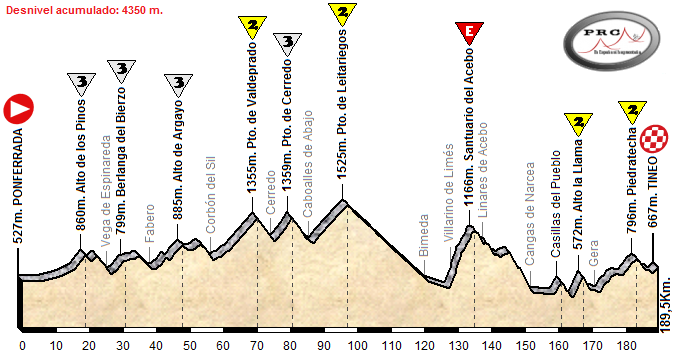 El periplo berciano cuenta con los suaves puertos de Los Pinos, Berlanga del Bierzo y Argayo, en un terreno sin apenas rampas de entidad pero bueno para el descontrol y las escapadas. Se pasa entonces el Puerto de Valdeprado, largo, tendido y regular, de 9,6 Km. al 4,5%, aunque contando el tramo anterior se totalizarían 13 Km. subiendo. Le sigue una rápida bajada para afrontar sin solución de continuidad las rampas del Puerto de Cerredo, 5,2 Km. al 6% y rematar el tríptico con otro puerto similar, Leitariegos por León y sus 10,3 Km. al 5%.