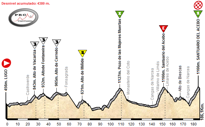 De Lugo parte la única etapa con final en alto de las propuestas, cuyo mayor interés se concentra al final con dos ascensiones hasta el Santuario del Acebo por dos vertientes distintas.