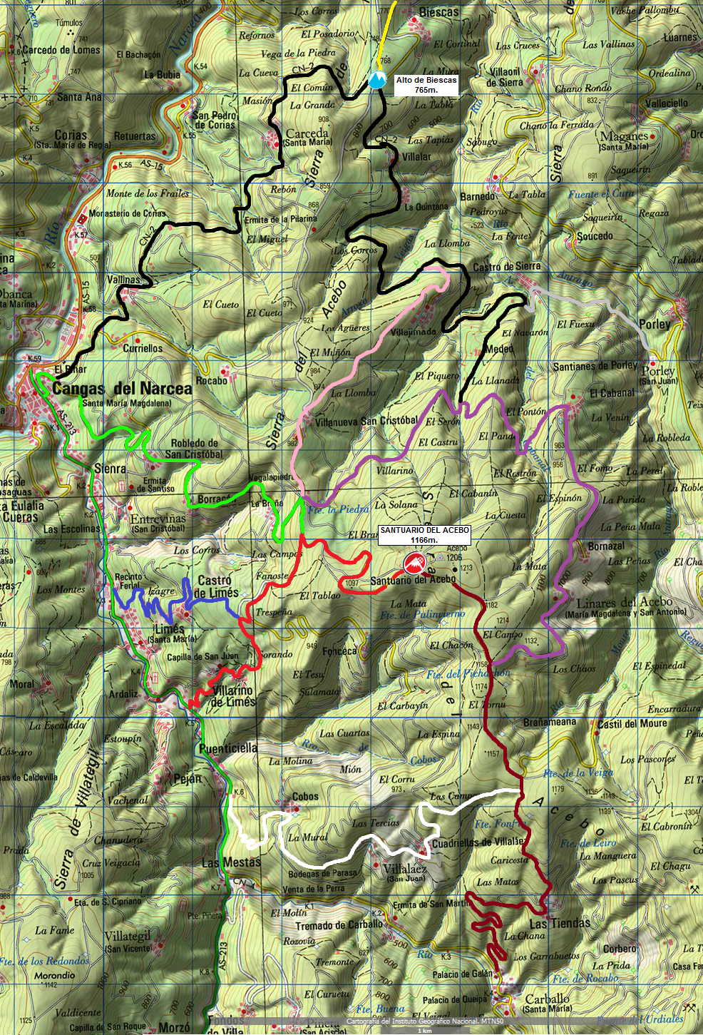 Después de semejante «ladrillo» de información, pasemos mejor a las etapas para que se entiendan más claramente las posibilidades de la zona. Hay que recalcar que los finales tanto en Cangas del Narcea como en el Santuario del Acebo son lógicos y perfectamente factibles. Cangas es un municipio grande, de más de 14.000 habitantes, cabecera y lugar de acceso al Parque Natural de las Fuentes del Narcea y de Ibias donde además se encuentra el Centro de Interpretación del mismo. Y el Santuario del Acebo es un concurrido centro de peregrinación (especialmente en verano), habilitado para el turismo y al que se le mejoraron los accesos para evitar atascos debido al volumen de tráfico en verano. Y Tineo, el otro final, es otro municipio de 10.000 habitantes con potencial turístico y que forma parte del Camino de Santiago Primitivo.