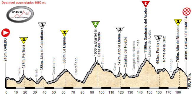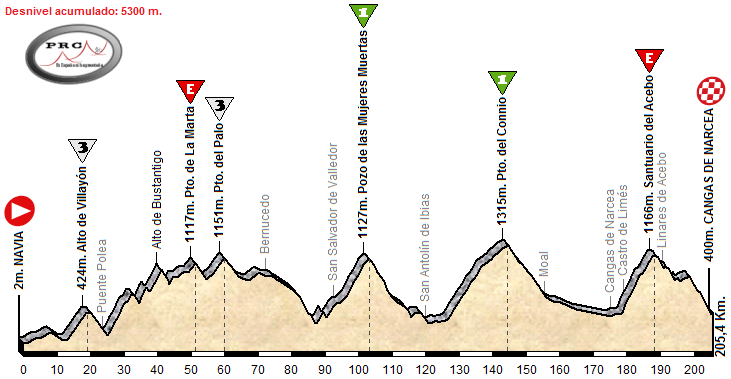 Tras su larga y sencilla bajada se afronta el terrible muro del Acebo por Villarino de Limés a 55 Km de la llegada, punto clave al que se llega tras una primera mitad de etapa de mucho desgaste. Se baja entonces a Cangas del Narcea y tras solo 7 Km. llano llega el quebrado terreno final. Primero se sube a Casillas del Pueblo que, pese a no puntuar, tiene 2,1 Km. al 6,8%. Enlaza perfectamente con el inicio del Alto la Llama, un pequeño muro de 2,5 Km. al 9,7%. Y para terminar se asciende a Piedratecha en dos escalones con rampas rondando el 6-7%.