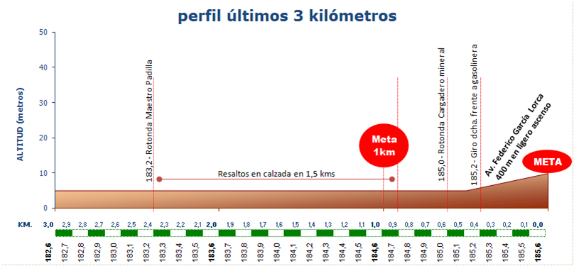 Por último queremos recalcar que la meta estará en la Rambla Federico García Lorca y los últimos 400 metros son de ligero ascenso. Pese a su escasa dureza seguro que a más de un corredor se le atraganta después de los casi 200 km de carrera.