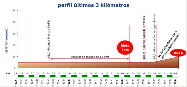 El rumbo oeste se mantendrá durante toda la parte final de la etapa y sólo las travesías de algunas urbanizaciones y pueblos pesqueros ofrecerán cobijo seguro frente al viento, al ser la mayor parte del trayecto muy abierto. Por otro lado, las rotondas ayudarán a estirar el pelotón en distintos puntos. En la localidad de Retamar se va a instalar el último sprint intermedio del día: si la fuga llega hasta ahí, será un punto de atención, pero si por el contrario ya ha sido neutralizada no tendrá el menor interés, ya que el maillot estará adjudicado.