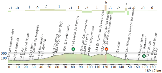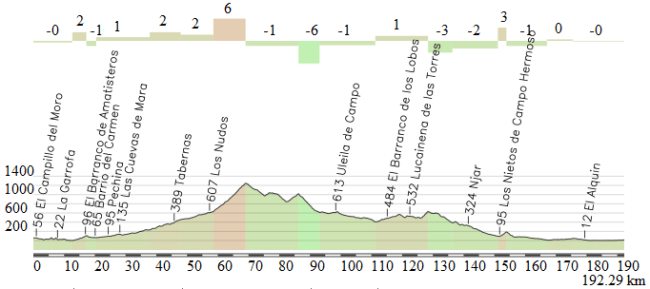 Pero incluso con la entrada en la capital por el este, para mantener la zona propicia para los abanicos del trazado de este año, cabía la posibilidad de haber hecho un recorrido previo más atractivo y que no lo fiara todo a la aparición del viento. Por ejemplo se podría subir el Collado García sur, con 6 km finales al 6,5 %, y Benizalon norte (de derecha a izquierda del perfil) antes del paso por Uleila, yendo directamente desde ahí hacia Lucaneina y la Serrata, sin el rodeo del trazado original.