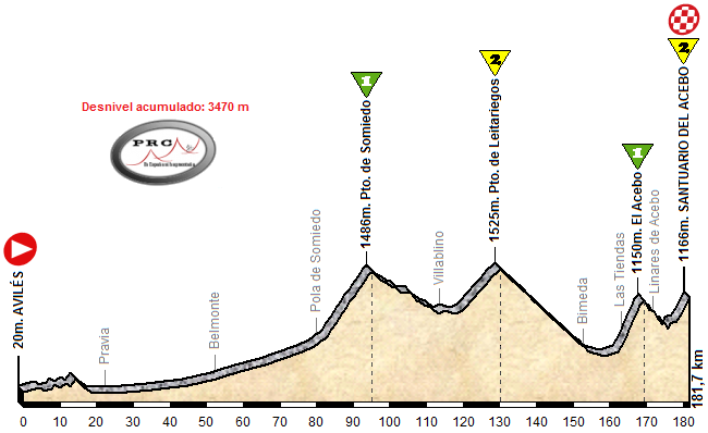 A la hora de diseñar la etapa pensamos en llegar a través del Puerto de Somiedo y el de Leitariegos, una combinación que aún no habíamos utilizado. Y de paso mostramos como para hacer una etapa muy bonita e interesante no hace falta mucha dureza, ya que solo se suben dos primeras y dos segundas. Se sale de Avilés por un terreno sencillo hasta comenzar en Pola la ascensión al precioso Somiedo (12,8 km al 6,3%), y tras el paso por León volver a Asturias por Leitariegos (10,5 km al 4,6%). Tras su larga bajada llega el trepidante final: primero, subir por la rompedora vertiente de Las Tiendas, con 5,5 km centrales al 10%, a la que sigue una corta bajada que nos deja en la subida final al Acebo por El Medeo, compartiendo los últimos 3 km con la vertiente habitual de Cangas, con pendientes que rondan el 9%.