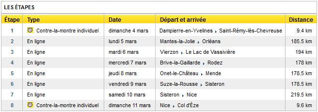 Después de las novedades de la pasada edición, el recorrido de este año vuelve a ser bastante tradicional, recuperando la contrarreloj inicial y un final en alto a mitad de carrera. De hecho, la principal sorpresa del trazado, una etapa final en forma de cronoescalada al Col d´Eze, no deja de ser una vuelta al final clásico de la década de los 70, 80 y primera mitad de los 90.
