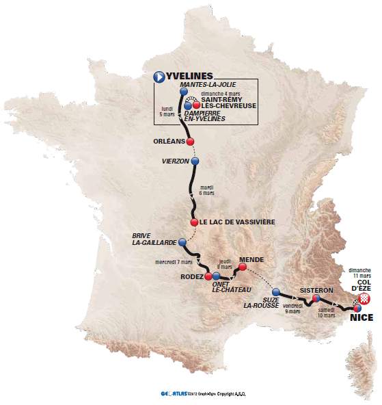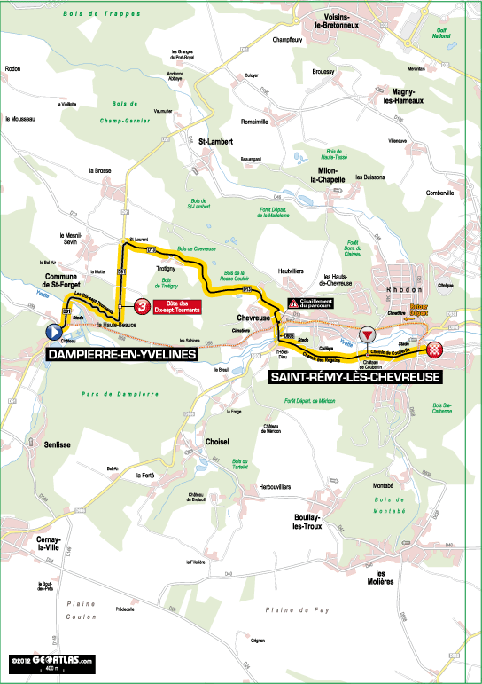 La París-Niza 2012 se inicia con una contrarreloj individual de 9 km, con salida de Dampierre en Yvelines y llegada en la población de Saint Remy les Chevreuse tras un complicado trazado que incluye una pequeña cota de 3ª en los primeros km.