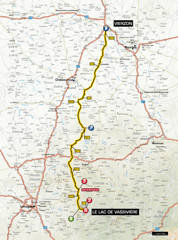 El tercer día de carrera le toca el turno a una etapa entre Vierzon y el Lago de Vassivière, uno de los más grandes de Francia y que está situado dentro del Parque Natural de Millevaches, cerca de la ciudad de Limoges.