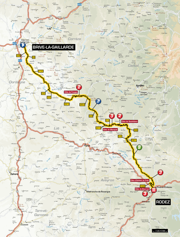 Etapa rompepiernas con salida en Brive la Gaillarde y llegada en la ciudad de Rodez, capital del departamento de Aveyron y situada en el límite sur del Macizo central. El recorrido incluye 5 cotas puntuables, 2 de ellas en los últimos 20 km y la propia llegada picando hacia arriba, con la línea de meta situada enfrente de la hermosa Catedral de Rodez.