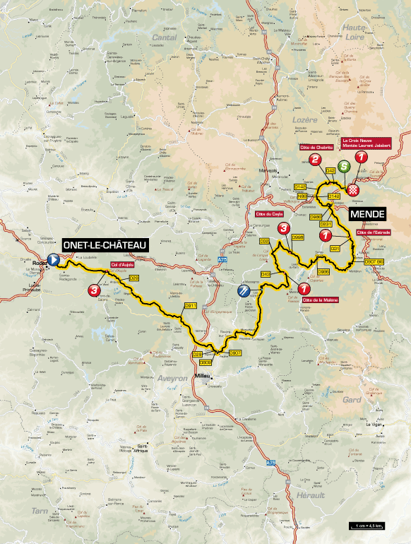 Casi de salida los corredores tendrán que afrontar la tendida cota de Aujols, con casi 8 km al 4% de media, y donde probablemente haya múltiples ataques en busca de la escapada del día. Después de coronar y tras un pequeño descenso, hay un largo tramo de falsos llanos antes de encarar la auténtica bajada hacia el valle del río Tarn y Aguessac. Superada esta población se entrará en la zona más sencilla de la etapa, con casi 35 km prácticamente llanos circulando por las preciosas«Gorges du Tarn», en el Parque Natural de Grands Causses, hasta llegar a la pequeña localidad de La Maléne, inicio de la cota del mismo nombre (según la organización, de acuerdo a los mapas sería Mazel Bouissy o bien Recoulettes). La parte más dura de la ascensión es justo el inicio, por encima del 10%.