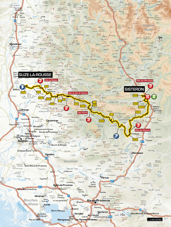 Etapa «rompepiernas», sin grandes puertos pero con un trazado quebrado (aunque menos de lo que aparenta el perfil) entre las localidades de Suze la Rousse, en el departamente de Drôme y a escasos 40 km del mítico Mont Ventoux, y la localidad de Sisteron, en los Alpes de Alta Provenza.