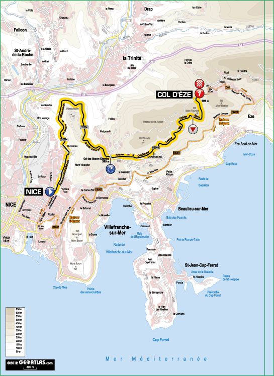 Etapa en línea alternativa, manteniendo salida y llegada y con los puertos de Colla Dona (2), Braus (1), Castillon (3), Madone (1) y Eze (2).