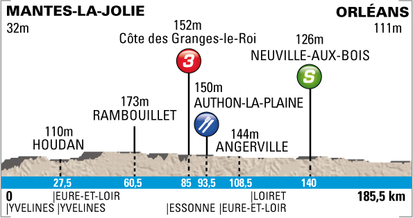 La primera etapa en línea tiene un recorrido casi completamente llano de 185 km, uniendo las localidades de Mantes la Jolie, en las cercanías de París, y Orléans, en plena llanura de Beauce.
