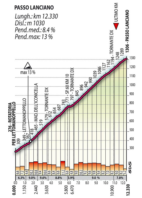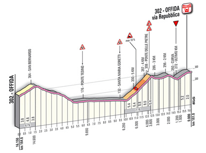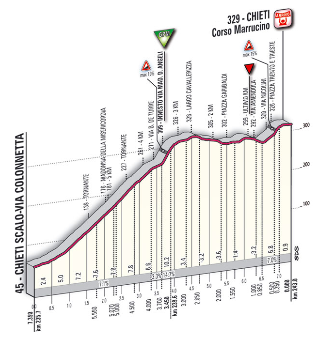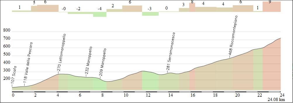 - Bucchianico (km 231,9): 366 m – 1,6 km – 7,5 %