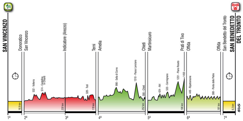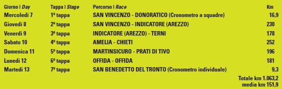 La carrera se inicia con una crono por equipos de 17 km, seguida por dos etapas en general llanas y favorables a los sprinters, con el kilometraje de la primera de ellas como aspecto más reseñable (230 km.) A partir de ahí le toca el turno a la media y alta montaña, con 3 etapas seguidas muy complicadas: llegada en Chieti tras 250 km de recorrido, incluyendo un especial como Passo Lanciano y un durísimo repecho cerca de meta, aunque finalmente se cambió la ruta; el mencionado final en Prati di Tivo, encadenado con un puerto previo de 20 km de ascensión; y llegada en Offida tras un duro circuito de 16 km al que se darán 6 vueltas. La última etapa será una crono individual en las calles de San Benedetto del Tronto, idéntica a la de 2011.