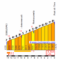 - Valico della Forchetta/Pretoro (incluye repechos previos, hasta el km 22,5) (km 212): 590 m