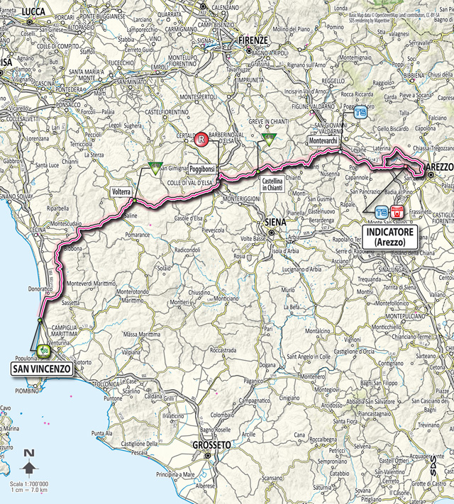 2ª ETAPA (Jueves 8 Marzo): SAN VINCENZO – INDICATORE (AREZZO) (230 km). Rutómetro / Salida / Llegada