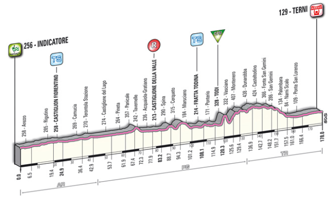 3ª ETAPA (Viernes 9 Marzo): INDICATORE – TERNI (178 km). Rutómetro / Salida / Llegada / Últimos km