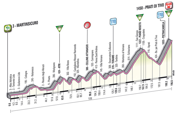 5ª ETAPA (Domingo 11 Marzo): MARTINSICURO – PRATI DI TIVO (196 km). Rutómetro / Salida / Llegada