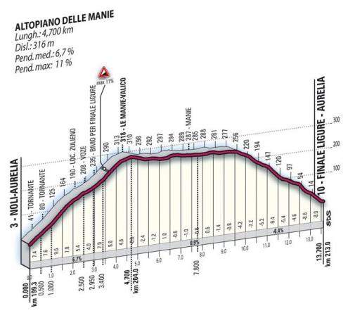 La subida al Turchino no tiene especial dificultad, siendo más reseñable su bajada: sin mucha pendiente pero revirada y de considerable longitud (10 km). Superado el descenso y 2 pequeños repechos hay un largo tramo llano por la costa de Ligure antes de afrontar Le Manie, sin duda la ascensión más exigente de la carrera, con 2 tramos de 500 m rondando o superando el 9%, y donde los equipos con corredores más completos deberían intentar forzar el ritmo para desgastar a los sprinters.