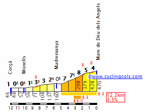 Precedida sólo por el flojo Col de la Ganga, la subida a Els Angles, catalogada de 1ª categoría (de un modo exagerado), tiene un primer repecho antes de Madremanya, si bien el auténtico puerto se reduce a los 5 kms finales -> perfil cada 500 m, relativamente duros al tener una media del 6,3 % y con un tramo de 2 km a casi el 8 %. Su situación, a solo 14 kms de la línea de meta, puede mover a algún favorito a intentar romper la disciplina del grupo y «cazar» algunos segundos en meta. En caso de fuga, la subida servirá para que ésta se seleccione.
