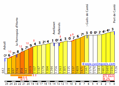 • Port del Cantó, Es (km 166,5):  1.730 m – 24,6 km – 4,8 %