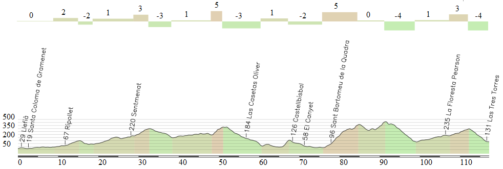 Los altos de Les Vilaredes y Sant Feliu Saserra apenas son concatenaciones de repechos que pondrán picante a la carrera en su primera mitad, teniendo de hecho menos dureza que el posterior «repechón» de Orista y la irregular ascensión a L´Estany (aunque no puntuan). A partir del km 80 y el paso por Moià la carrera buscará el Vallés, tomando una fisonomía más favorable. No será hasta los últimos km cuando volverán las dificultades con la ascensión a la Conreria, lugar donde los que quieran evitar el sprint tendrán que poner un ritmo muy fuerte para hacer daño a los velocistas.
