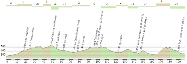 La etapa en sí es una jornada clara de media montaña. Comienza con un tramo que pica hacia arriba hasta afrontar el Alto de la Granadella (2ª), con 6,5 kms al 5% aunque después la carretera sigue subiendo de un modo muy tendido, como se puede ver en el perfil. Oficialmente, no habrá ningún otro alto puntuable en el recorrido hasta Montserrat, si bien se puede observar que los repechos serán continuos durante todo el día, varios de ellos de suficiente entidad como para haber sido marcados de 3ª.