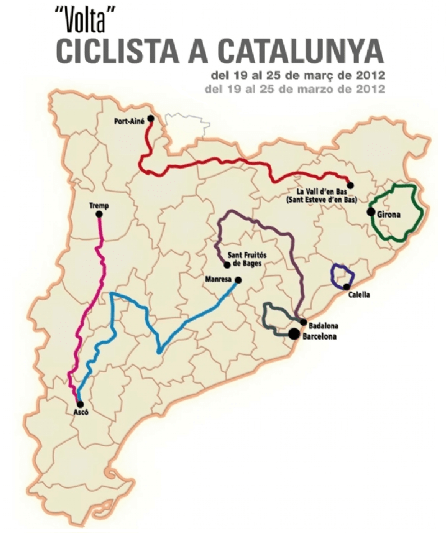 De este modo, la Volta 2012 empieza con 2 etapas de media montaña cortas y de trazado circular en torno a Calella y Girona respectivamente, la primera más dura en su parte central y la segunda en la final pero en ambos casos con un pequeño puerto en los últimos 20 km, Collsacreu y Els Angels, este último ya con capacidad para romper el grupo si se sube a buen ritmo. Al tercer día de carrera llegará la mencionada etapa con final en Port Ainé, con un buen kilometraje y un recorrido previo muy exigente, sobre todo para estas alturas de año, por lo que si hay batalla las diferencias en meta pueden ser muy apreciables. Una gran jornada reina, a la altura de la tradición de la Volta pero que se había perdido en los últimos años.