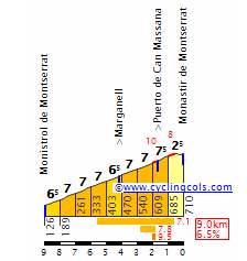 • Montserrat (hasta el km 7,4), 1ª (km 184,3):  650 m – 7,5 km – 6,8 %
