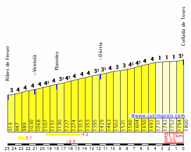 • Collada de Toses, 1ª (km 74,5):  1.800 m – 24,5 km – 4 %
