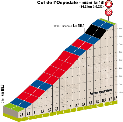 Sin lugar a dudas, la etapa reina, con final en alto en el Col de l´Ospedale y varios puertos de paso en la primera mitad del recorrido, destacando el Col de Bacinu, acumulándose durante toda la ruta más de 3500 m de desnivel. Salvo suceso extraño en las etapas del sábado, esta jornada será totalmente decisiva para la general de la prueba, con una subida final que si bien no tiene rampas muy duras puede hacer bastante daño por su longitud y constancia si el ritmo es elevado, como se vio en 2011.