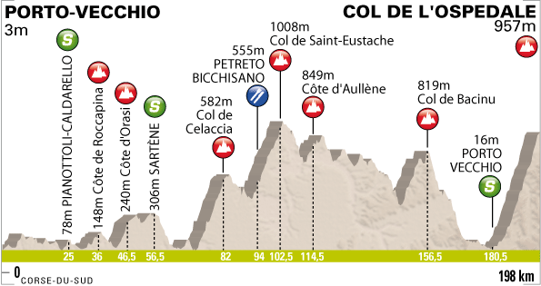 Etapa alternativa con salida y llegada en Porto Vecchio, pasando por Conca (3), Larone + Bavella (HC), Quenza (3), Mela (2) y Bacinu (2), con el km final picando hacia arriba.