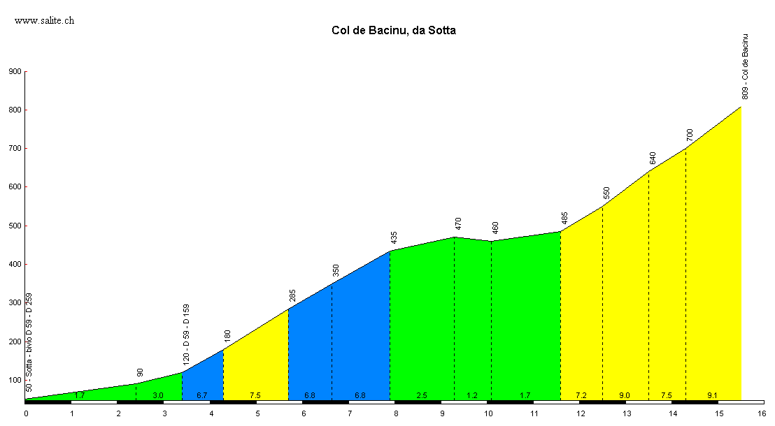 - Col de Bacinu (km 22): 817 m – 12 km – 5,8 %