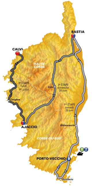 Será la primera vez a lo largo de su historia en que el Tour visite esta isla, siendo hasta ahora la única región de la Francia metropolitana por donde no había transitado la carrera. Además del Critérium Internacional, las otras pruebas que han celebrado aquí etapas son la París-Niza (1963-64-66) y el Tour de Córcega.