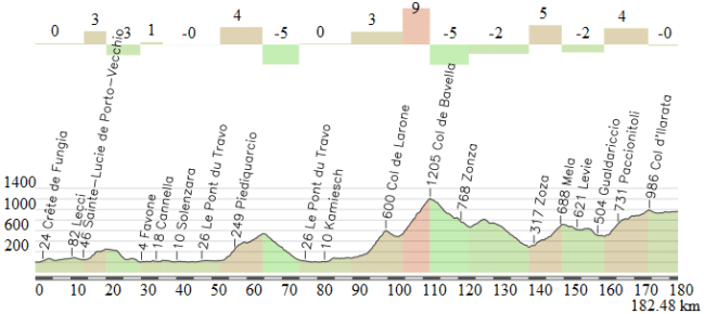 –3ª. Ajaccio – Calvi (145 km), con el Col de San Bastiano (415 m), Col de Lava (498 m), Col de Palmarella (374 m) y Col de Marsolino (443 m).