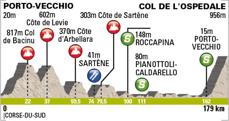 –2ª. Bastia – Ajaccio (155 km), con el Collo di San Quilico (559 m), Col de Bellagranajo (723 m), Col de la Serra (807 m), Col de Vizzavona (1163 m) y Monte Salario a 10 km de meta.