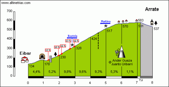 Superado el puerto, cuya cima se encuentra a 21 km de meta, se inicia un descenso técnico que puede resultar más complicado que la propia ascensión, sobre todo si llueve, ya que la carretera está en buenas condiciones pero es muy revirada. La bajada termina en Elgoibar, localidad desde donde restarán 7 km de falso llano ascendente hasta llegar a Eibar e iniciar la subida final a Arrate-Usartza. No es un coloso ni mucho menos, pero la dureza y constancia del tramo central, rondando casi siempre el 9-10%, puede hacer daño y marcar diferencias entre los favoritos si el ritmo durante la etapa y la propia subida es elevado.