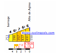 Superado el túnel de la cima, corto descenso hasta el embalse de San Antón, donde sin un km llano da comienzo la subida a Agiña: una ascensión sin rampas exageradas (aunque con puntas del 10-11%, como se puede ver en este otro perfil) pero bastante regular, con 3 km centrales rondando el 7 %.