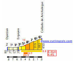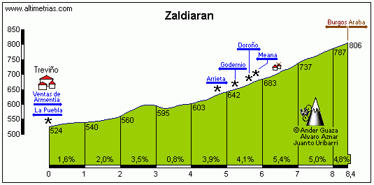 La tendida subida a Zaldiaran, con un tramo final de 4 km al 4,8 % de media. Click para ver una descripción detallada.