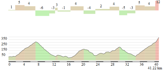 Justo de salida los corredores tendrán que superar 2 buenas subidas (aunque muy cortas) y sus respectivos descensos, para pasado el km 4 entrar en una carretera más llana y cómoda. El tramo central de la crono es la zona más favorable para los rodadores, pero en los últimos km el trazado vuelve a complicarse con un duro repecho (en teoría el mismo de la etapa anterior, aunque el rutómetro no lo aclara), desde cuya cima restarán menos de 2 km para la línea de meta. En resumen, una contrarreloj dura, por distancia y sobre todo trazado, y que si llueve puede resultar bastante peligrosa, siendo a priori una etapa decisiva para la general.
