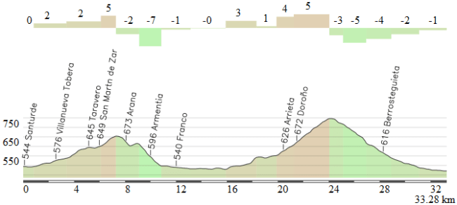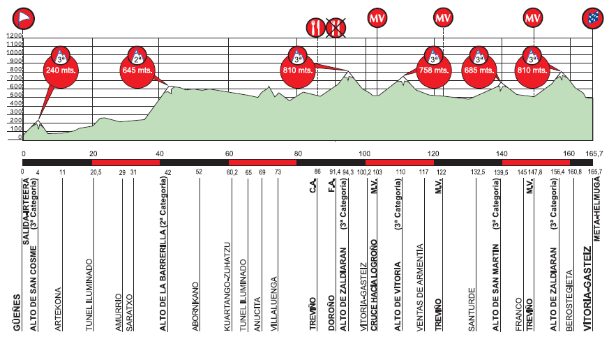 La segunda mitad de la etapa con los pequeños puertos de Zaldiaran, Vitoria, San Martin y de nuevo Zaldiaran, todos ellos de pendientes suaves, harán que los equipos de los velocistas se deban esforzar para reducir la distancia con posibles fugas y controlar el grupo en busca de un sprint masivo, algo que después de esta etapa no podrán repetir.