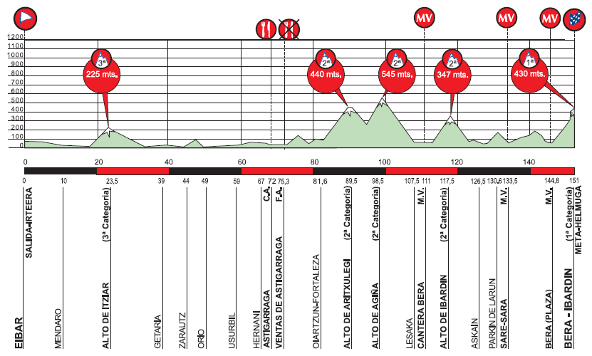 4ª ETAPA (Jueves 5 Abril):  EIBAR – BERA (IBARDIN)  (151 km).  Rutómetro y horarios