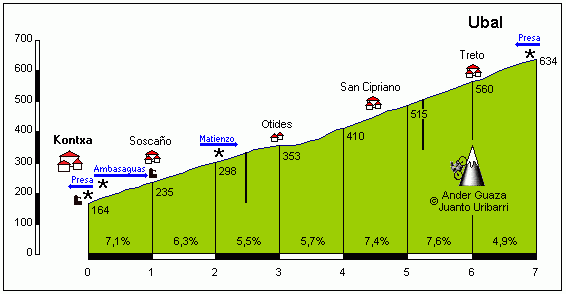 La subida a Asentzio, con 3,5 km finales al 7,8 %. Click para ver una descripción detallada.