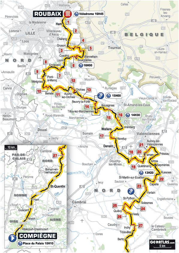 La carrera, como viene siendo tradicional, tomará como punto de partida la localidad de Compiegne y terminará en el velódromo de Roubaix, al que los corredores deberán dar una vuelta y media antes de terminar la carrera.
