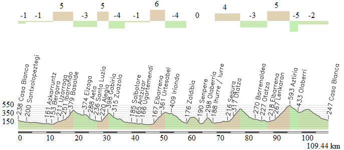 Este tríptico sin apenas descanso, donde el pelotón podría romperse en multitud de pequeños grupos, daría paso a un tramo más sencillo, con 6 km llanos … antes de que la ruta vuelva a complicarse con la subida a Barbari: 3,8 km al 7,9 % de media -> galería fotográfica. Hay que aclarar que la inclusión de Barbari por esta vertiente (más dura que la contraria) supone hacer un circuito, pero no habría problemas de cruces ya que el bucle tiene 16,5 km. La última gran subida de la jornada sería Aztiria por Mutiloa, con un tramo central de 4,5 km al 7 %, aunque después de su corta bajada todavía restaría el falso llano hasta coronar Udana, cuyo descenso llevaría a las corredores hasta la línea de meta en Oñati.