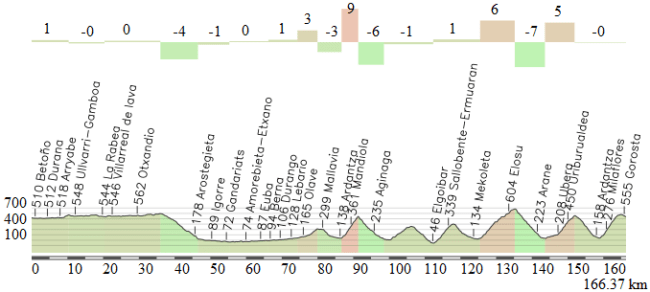 Cabe señalar que es factible hacer etapas mucho más selectivas con llegada en Vitoria, utilizando el encadenado Rivas + Herrera + Zaldiaran (o Puerto Vitoria) -> perfil 45 km finales con Herrera y Zaldiaran, pero teniendo en cuenta el global del recorrido propuesto creemos que sería excesivo, siendo mejor una etapa más llana para que los sprinters tengan su oportunidad. De todos modos, en el caso del recorrido original si hubiera encajado perfectamente -> alternativa completa Güeñes – Vitoria. Ójala los organizadores se atrevan en alguna edición con algo así, en vez de hacer siempre la típica etapa de Vitoria sin grandes dificultades previas.