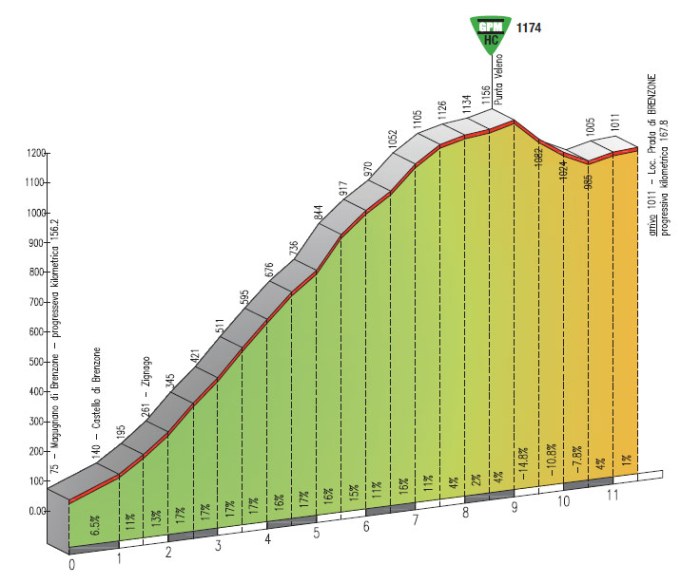 Las diferencias en meta pueden ser muy grandes, aunque como se ve en el perfil la etapa no acaba exactamente arriba sino que hay 2,5 km desde la cima de Punta Veleno hasta la línea de meta: 1,5 km de fuerte descenso, especialmente el primer tramo, y un km final picando hacia arriba ya en la localidad de Prada Alta, perteneciente a Brenzone.