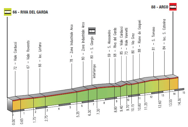 1ª ETAPA (Martes 17 Abril): RIVA DEL GARDA – ARCO (C.R.E.) (14,3 km). Rutómetro / Últimos km