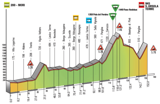 De inicio un tramo llano seguido de un puerto, Vigolo Vattaro, no excesivamente duro pero muy continuo en sus rampas y que servirá para formar fugas. En cualquier caso, resulta extraño que no puntúe para la clasificación de la montaña, pudiéndose considerar perfectamente un 2ª.
