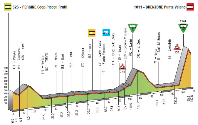 La etapa comienza con un falso llano descendente y la tendida subida a Lases, por debajo del 3%, para una vez finalizada su bajada recorrer todo el Trentino, de norte a sur, sin ninguna dificultad orográfica. De hecho a mitad de la ruta se abandona el Trentino para entrar en la región del Veneto, donde concluirá la etapa. Una vez en Caprino Veronese, a unos 50 km de la llegada, comienzan las dificultades con la ascensión a Lumini, con 6,8 km al 6,5 % según cifras oficiales (aunque después sigue subiendo ligeramente) y que supondrá un primer escollo que quizás se plantee para buscar fugas y lanzar corredores por delante del grupo. Su descenso (desde el km 8) dejará a los ciclistas en las puertas mismas de la localidad de Garda y su grandioso lago, una zona preciosa como se puede observar en las fotografías, aunque todavía restarán 20 km llanos por la orilla del lago hasta llegar a Brenzone.